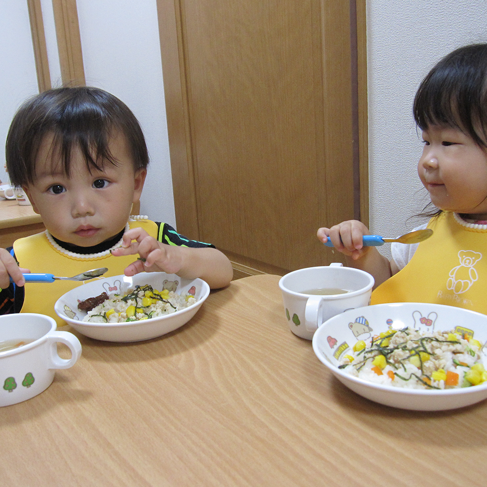 楽しい雰囲気の中で、園で手作りしたできたての給食をいただきます。自分で食べようとする気持ちを大切にし、見守りながら必要に応じて援助していきます。