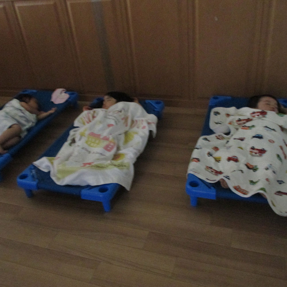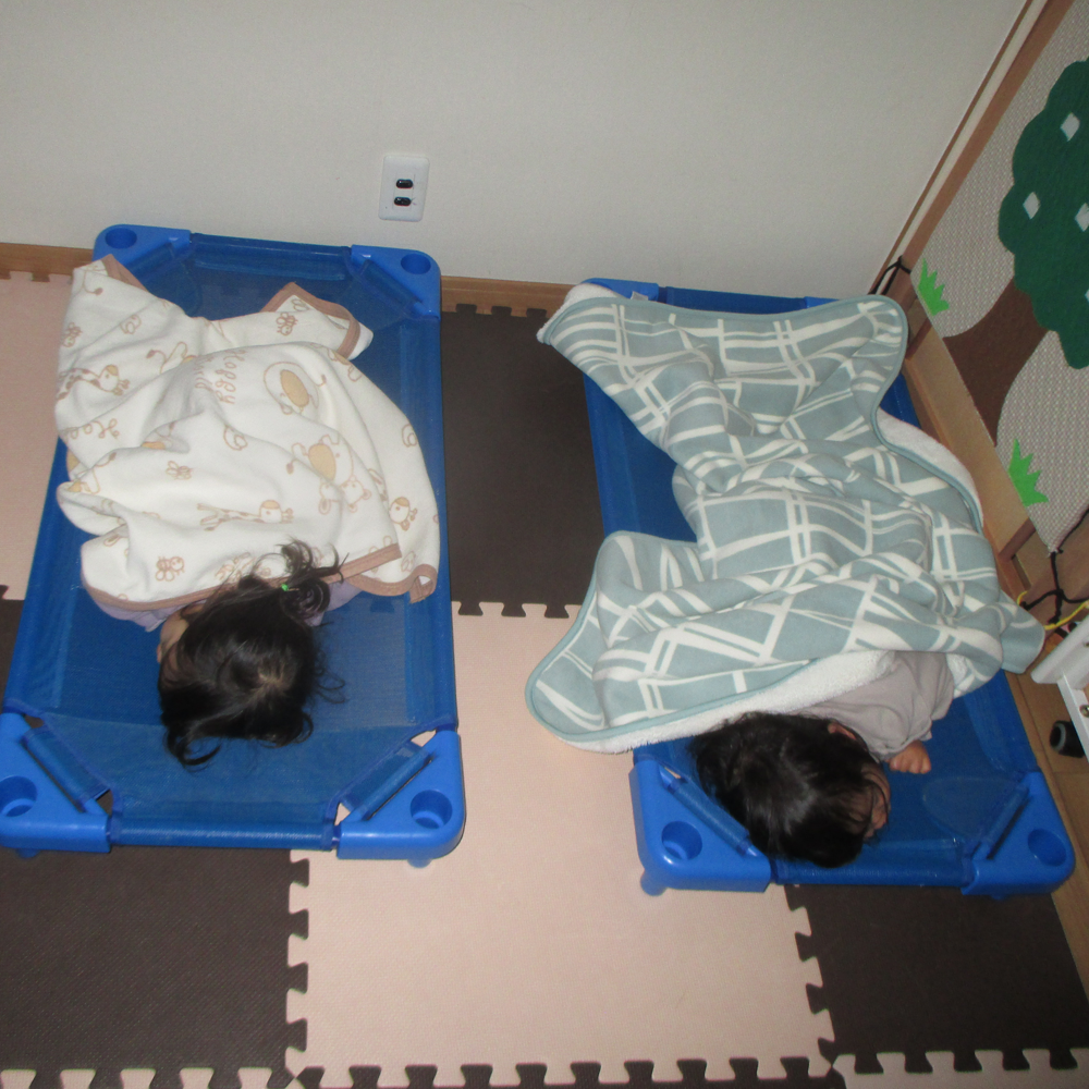 おなかがいっぱいになったらお昼寝の時間。ゆったりと身体を休めます。お昼寝中は保育士がそばで見守り、5分ごとに姿勢や呼吸のチェックをしています。