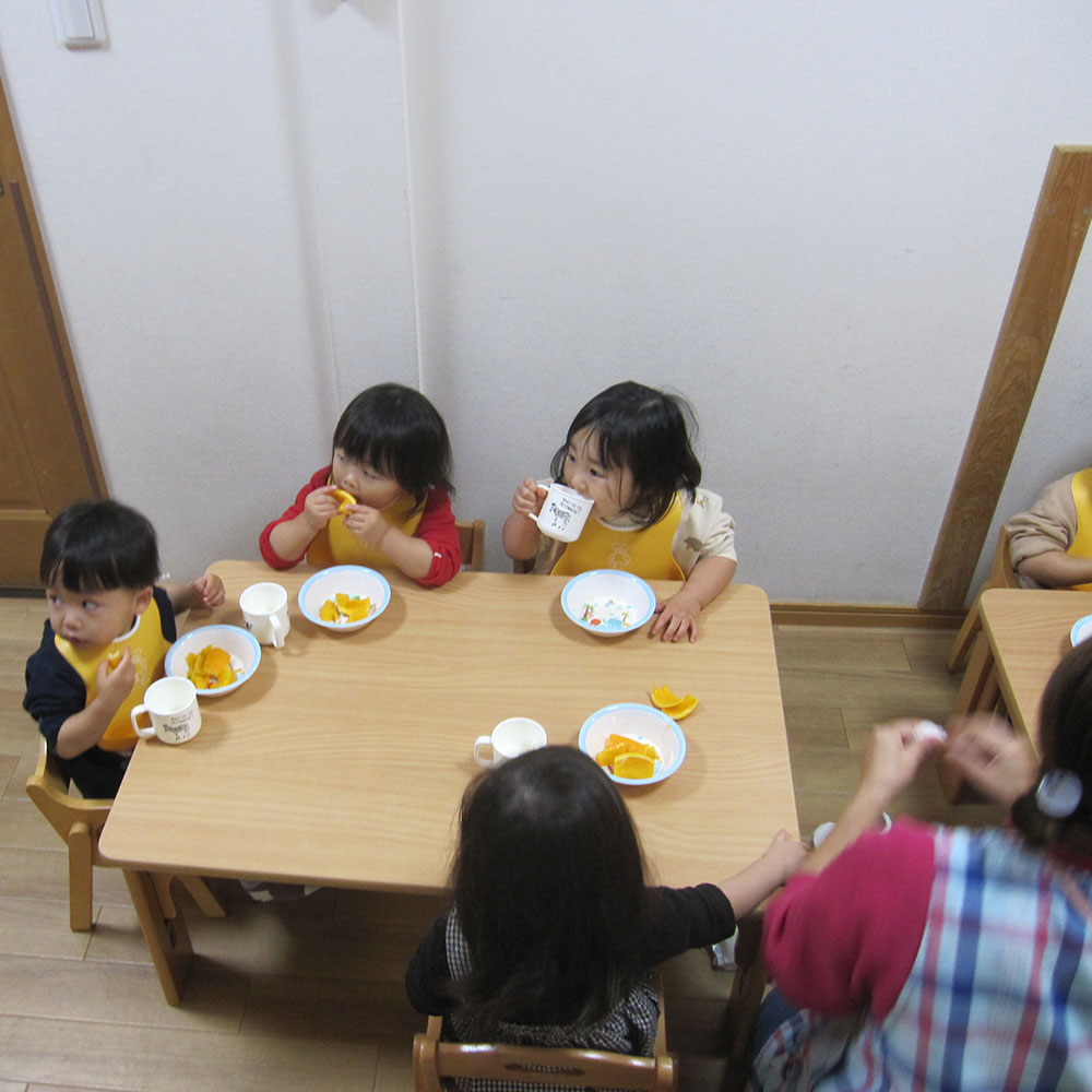 お片付けをしたら、朝の会をします。季節のお歌を歌ったり出欠確認をします。おやつは果物などを食べて、午前の活動の意欲を高めます。